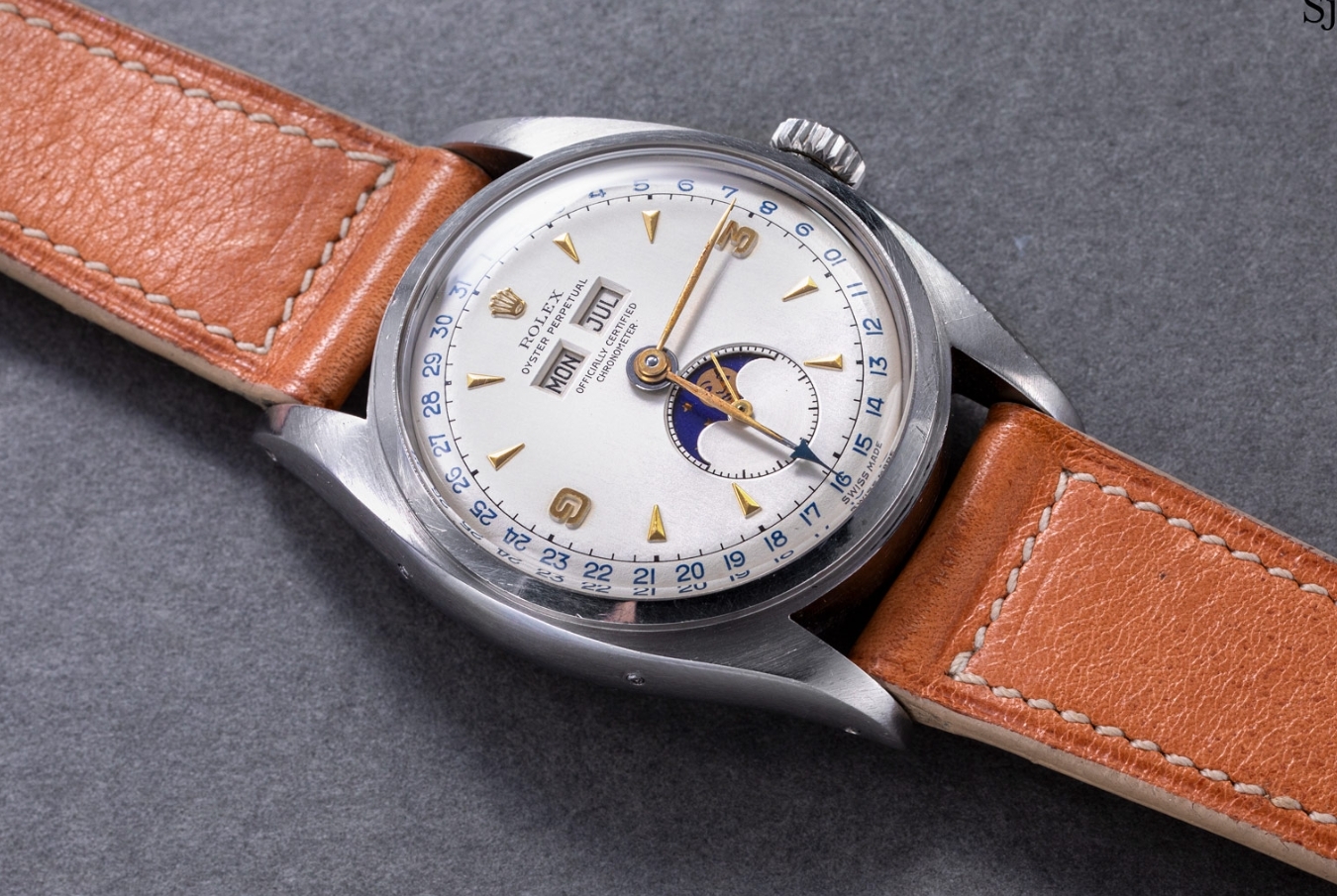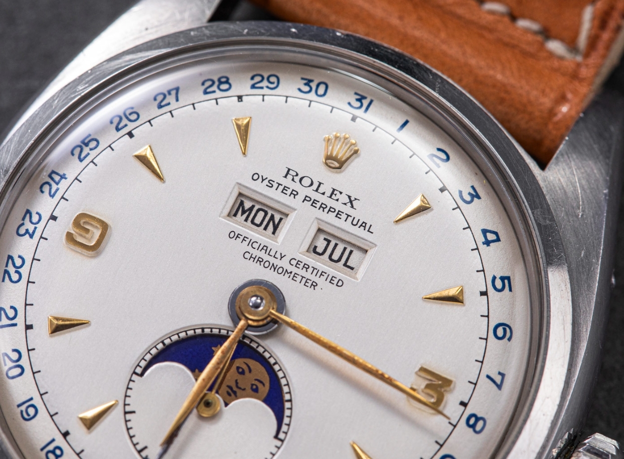 Another notable detail on the dial are the calendar windows, both of which retain the sharply bevelled edges that characterise an original dial that has not been cleaned or reworked.