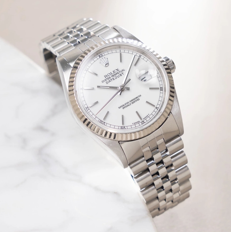The Datejust 16234 is a bit more low-key, but the white gold fluted bezel and polished center links on the Jubilee bracelet add that extra playfulness in the sun.