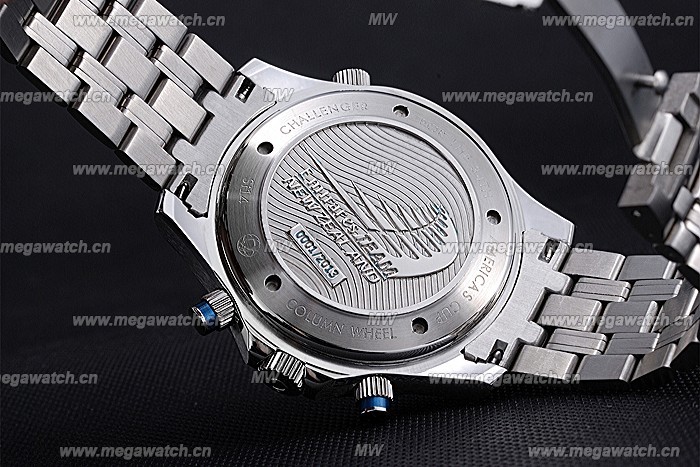 Crown Omega logo engraved polished stainless steel cutwork crown with black enamel strip round push button crown on either side of it plus a logo engraved polished stainless steel cutwork crown on opposite top corner