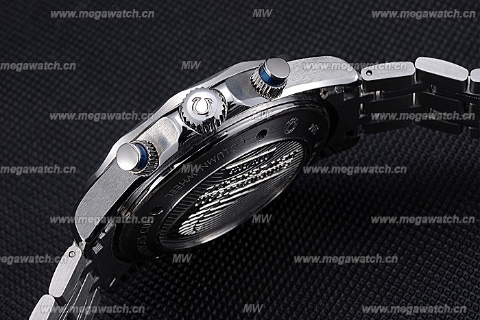 Crown Omega logo engraved polished stainless steel cutwork crown with black enamel strip round push button crown on either side of it plus a logo engraved polished stainless steel cutwork crown on opposite top corner
