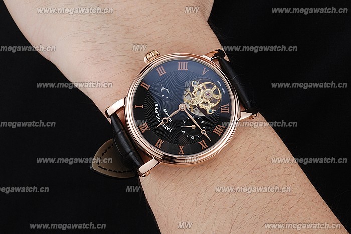 Patek Philippe Complications Moonphase Tourbillon Black Dial Rose Gold Case Black Leather Strap Fake Patek Philippe