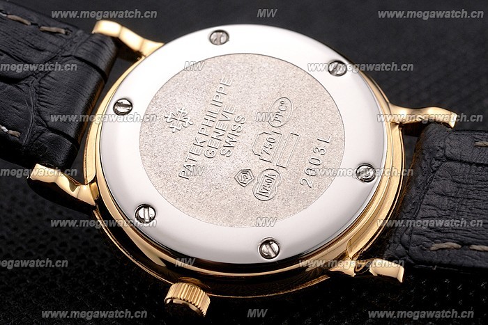 Patek Philippe Calatrava Gold Dial Roman Numerals Double Ribbed Bezel Gold Case Black Leather Strap Aaa Grade Patek Philippe Replica